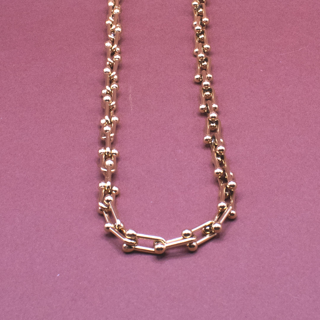 PIENZA, este collar tiene un diseño clásico y atemporal, siempre será tu mejor opción para elevar un look casual. Nuestra colección PRAGMA está hecha en acero inoxidable y los accesorios dorados tienen baño de oro de 18 quilates, materiales resistentes y de gran calidad. No se ponen negros.