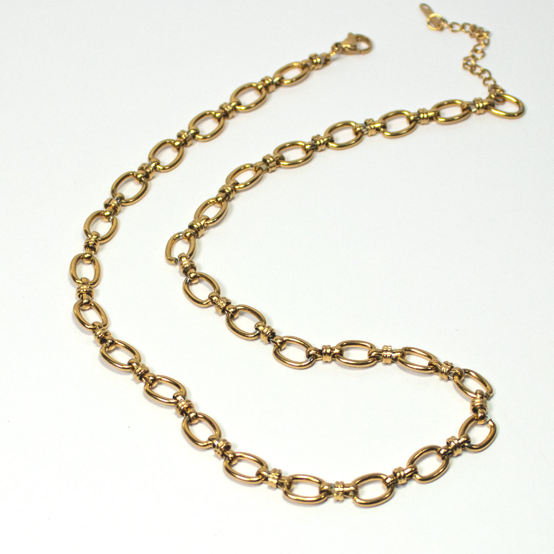 VARENNA, este collar tiene un diseño clásico y atemporal, siempre será tu mejor opción para elevar un look casual. Nuestra colección PRAGMA está hecha en acero inoxidable y los accesorios dorados tienen baño de oro de 18 quilates, materiales resistentes y de gran calidad. No se ponen negros.